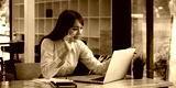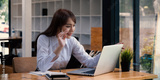 Cheerful young asian woman using laptop computer at home. Student female in living room. online learning, studying , online shopping, freelance, asean concept