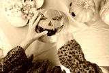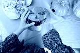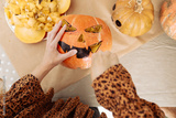 Close up of young woman carving Jack O Lattern from ripe orange pumpkin with knife on her wooden kitchen table. Female preparing all hallows eve Halloween party decorations. Background, copy space.