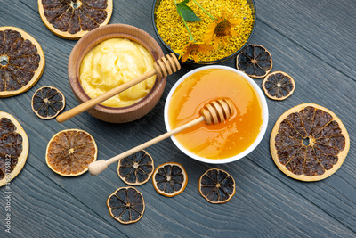 Fresh flower honey of different varieties, pollen and honeycomb with spoons on a wooden background. Organic Vitamin Health Food