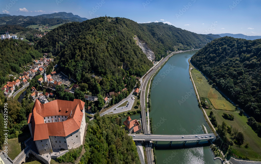Aerial view of the medieval castle Rajhenburg near Krsko and river Sava valley, Slovenia