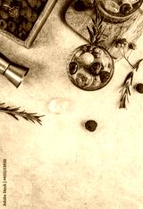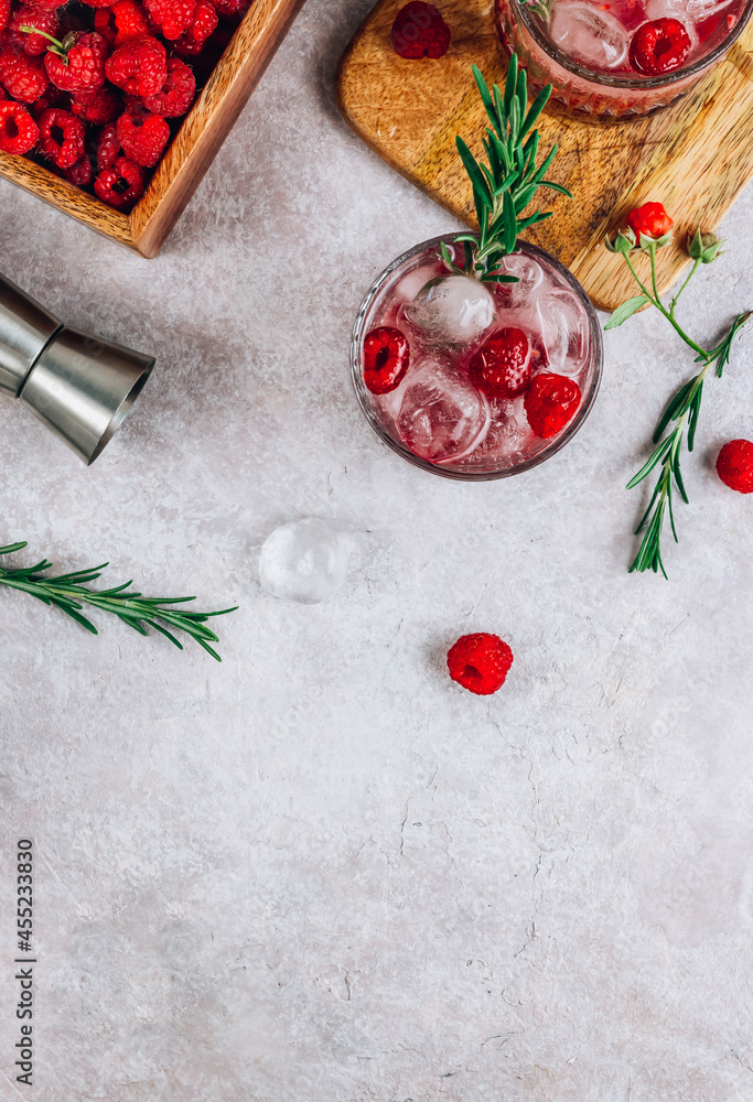 Raspberry lemonade in a glass with ice and fresh rosemary on a stone background.