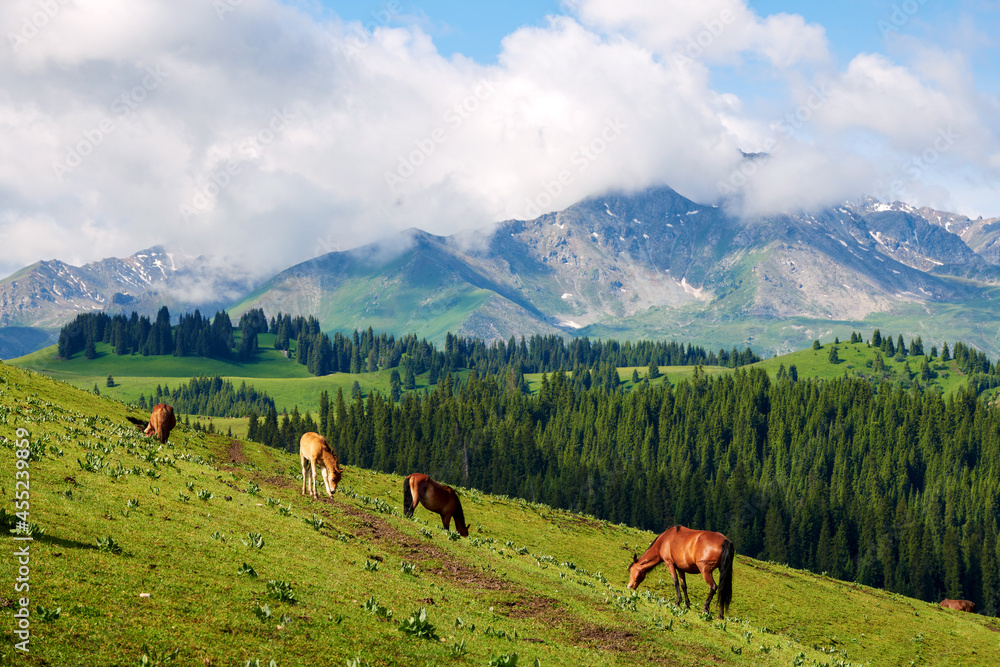 The horses in high mountain meadow of Yining city Xinjiang Uygur Autonomous Region, China.
