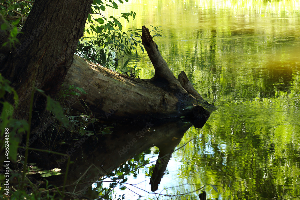 Landscape of trees with reflection in water on a sunny summer day.