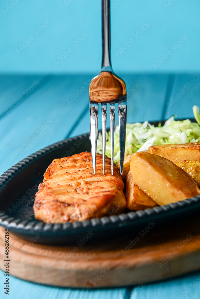 Grilled Chicken Steak with fried potatoes in rural style and coleslaw salad served in a tray over blue background.