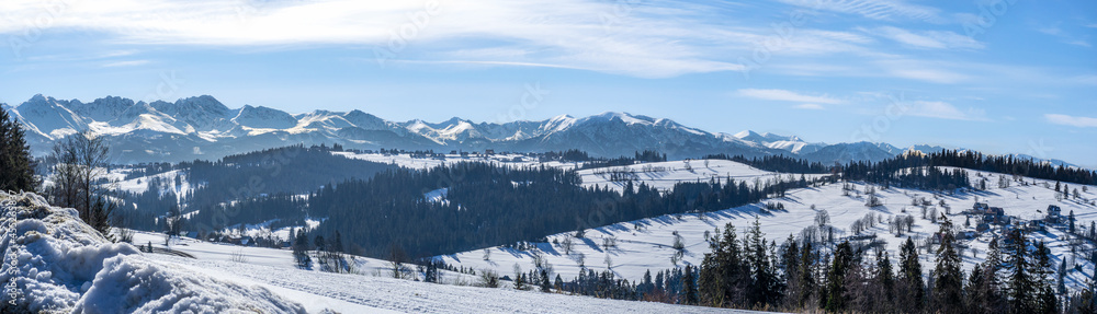 Wide panorama of Tatra mountains , western part, in winter viewed from Bukowina Tatrzanska in Poland