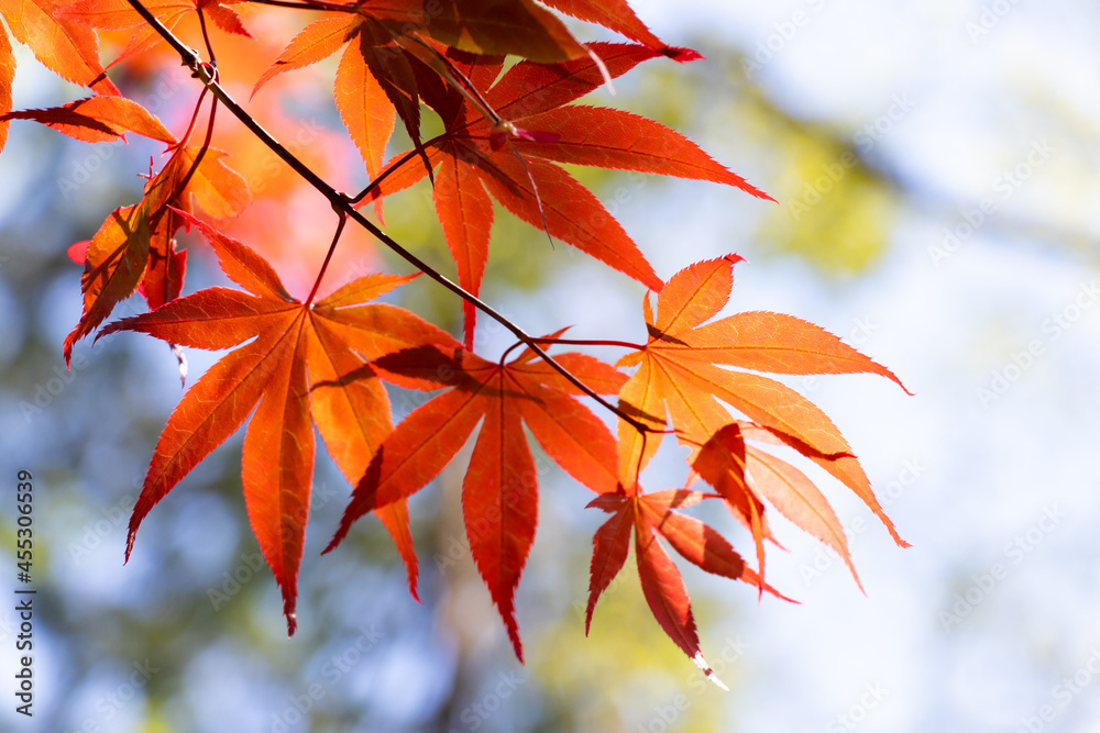 Red color of falling leaf with blurred leaf and sky background