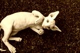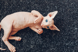 Canadian sphynx kitten lying on carpet at home. Hairless pet has blue eyes. Curious cat looks up