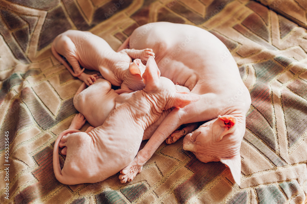 Three sphynx kittens drinking sucking mother's milk at home. Cat family eating. Animal feeding kids
