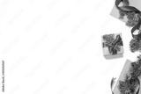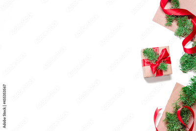 christmas layout on white background, spruce branches, gift, ribbons, craft paper, free space, top view, layout