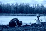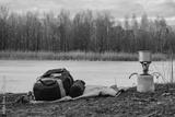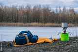 Charge your smartphone while traveling with a power bank. A portable charger charges the phone against the backdrop of a tourist gas burner and a forest.