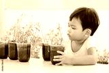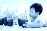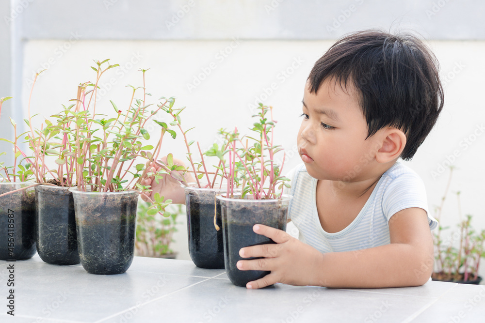asia adorable cute little kid boy planting flowers in home's garden. Child having fun with gardening.