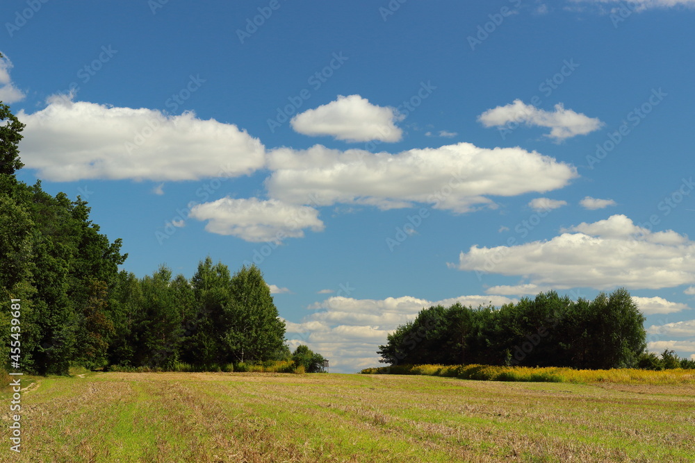 Summer landscape with a meadow, trees, sky and clouds.