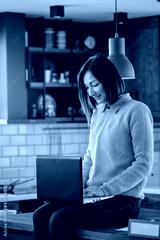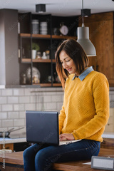 Freelance woman working in home office with laptop computer. Flexible workspace and working time.