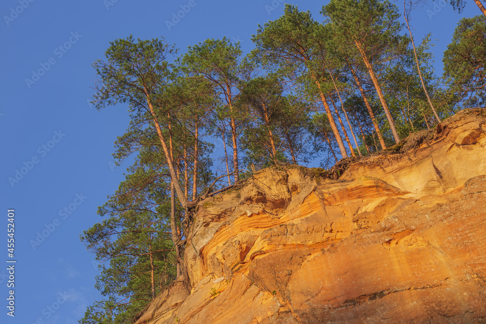 Peaceful landscape with red sandstone Erglu kliffs steep rocks in Gauja National Park in Valmiera area