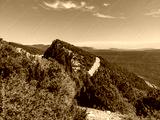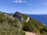 Panoramic landscape of Lefkada island coast cliffs in Greece. Green woods, drive road, blue sky and vivid sea. Summer travel