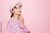 帽子をかぶったカジュアルな若い女性のピンク背景のポートレート