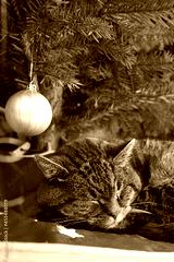 Gray cat sleeps under the Christmas tree.
