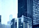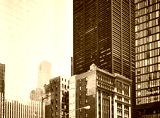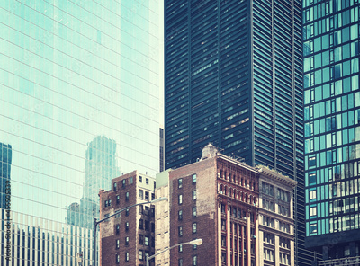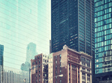 Old townhouse buildings between modern skyscrapers in New York, retro color toned picture, USA.