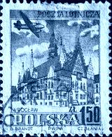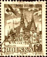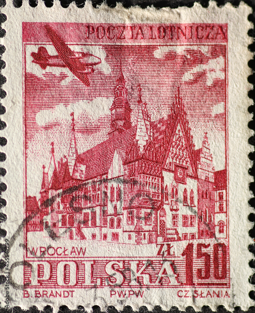 POLAND-CIRCA 1954: A post stamp printed in Poland showing a historic town hall building with a propeller plane in the sky