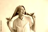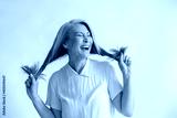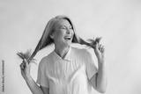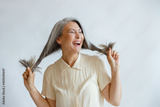 Joyful Asian lady in blouse holds long hoary hair laughing on light grey background in studio. Mature beauty lifestyle