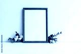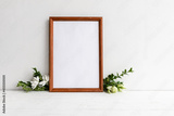Fashionable female background on a white table - flowers and an empty photo frame. Wedding female background. Blank for a postcard.
