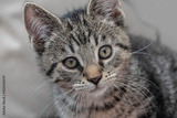 Portrait of a cute tabby kitten. Newborn kitten, Baby cat, Kid animal and cat concept. Domestic animal. Home pet. Cozy home cat, kitten. Copy space