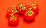 red tomatoes with a green stalk, on a red background, concept,