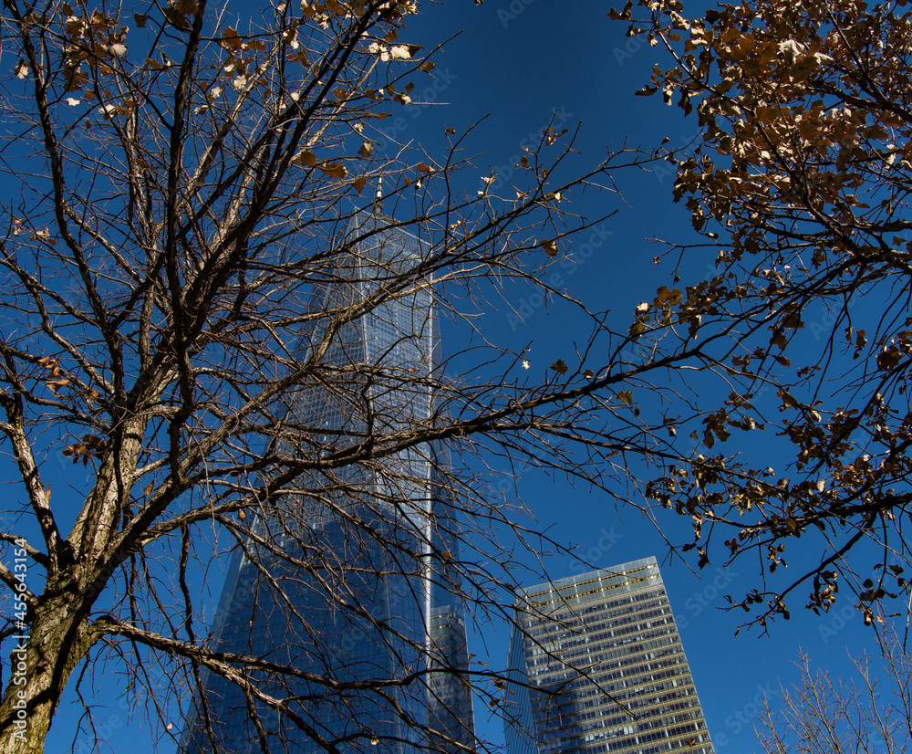 Vista dell' One World Trace Center con alberi sovrapposti.