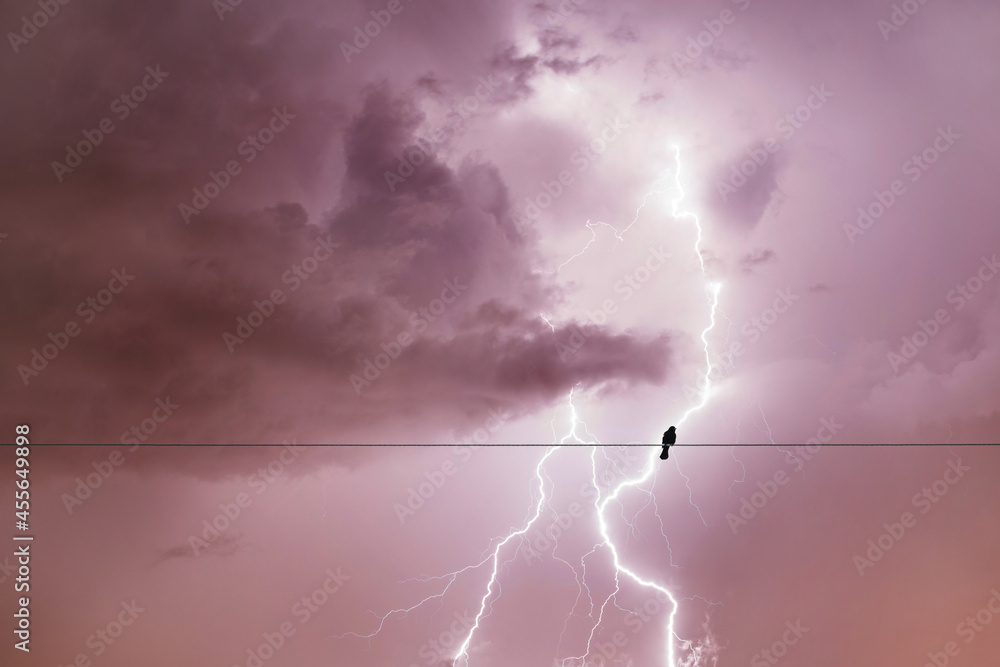 Alone bird on a wire or electric line on the stormy sky with lightning strike background. Loneliness concept