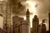 Chicago skyscrapers at rainy day with stormy sky with lightning strike background
