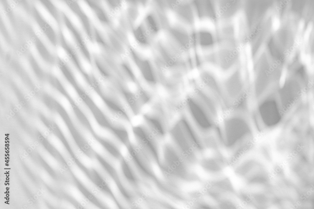 Blurred defocused water texture overlay effect for photo and mockups. Organic drop diagonal shadow and light caustic effect on a white wall. Shadows for natural light effects