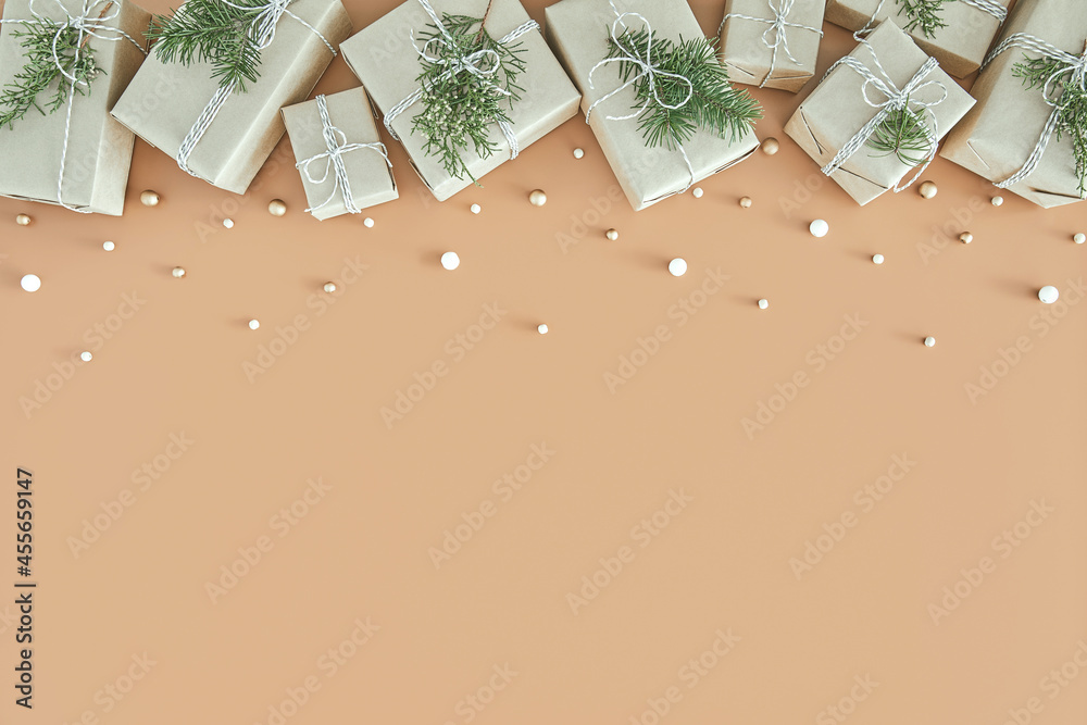 Small Christmas gift boxes wrapped in craft paper with green fir tree decorated branches on solid beige background. Modern minimal xmas presents pastel backdrop with copy space. New Year celebration