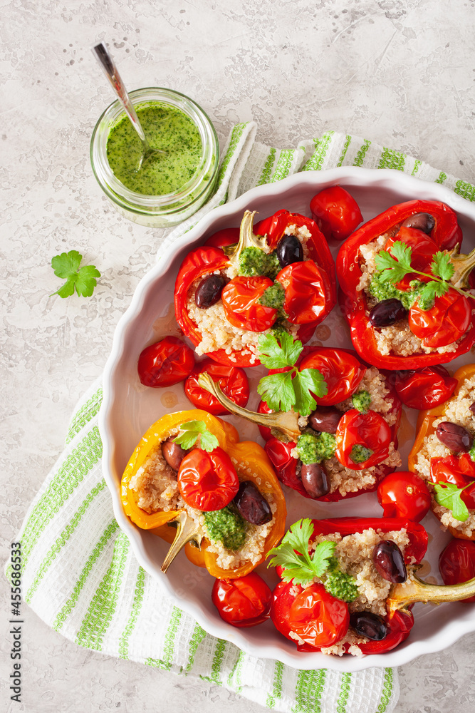 stuffed bell peppers with quinoa tomatoes olives and herb sauce chimichurri