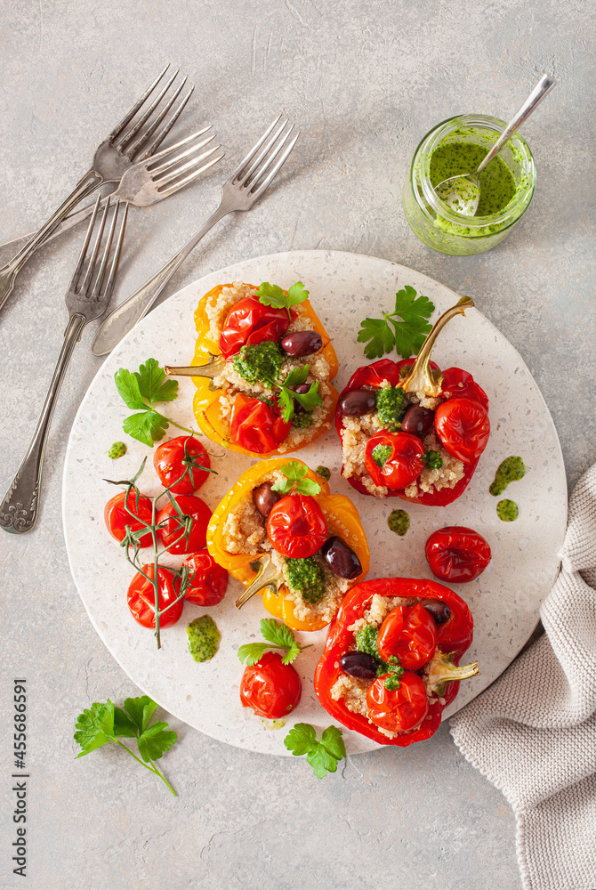 stuffed bell peppers with quinoa tomatoes olives and herb sauce chimichurri