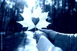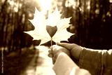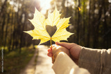 Lovers man and woman holding autumn maple leaf with a hole in the form of heart in their hands while walking in park at sunny day. Close up, cropped