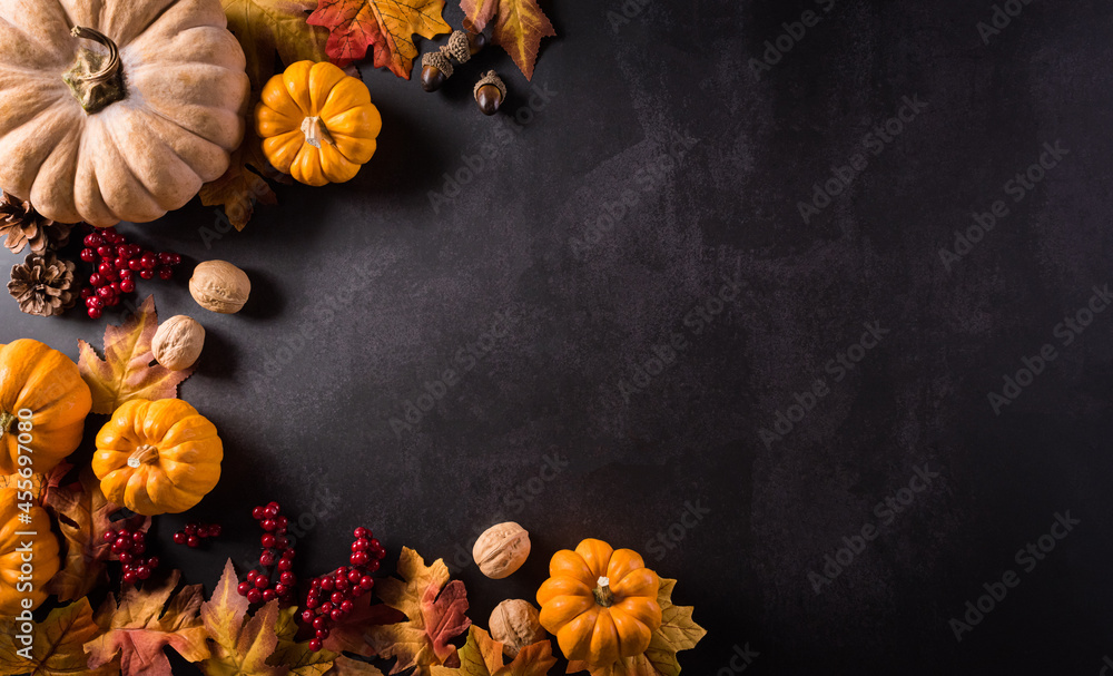 Autumn composition. Pumpkin, cotton flowers and autumn leaves on dark stone background. Flat lay, top view with copy space