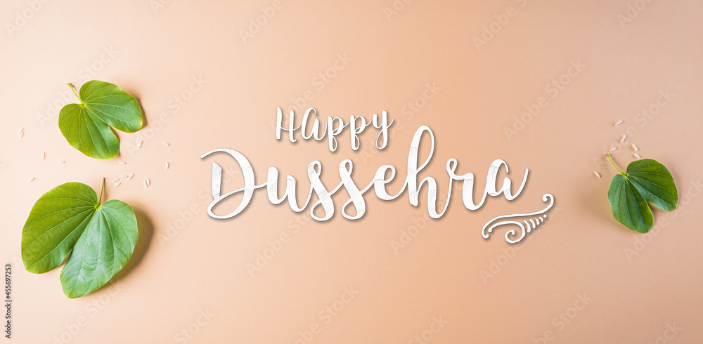 Happy Dussehra. Green leaf with the text on orange pastel background. Dussehra Indian Festival concept.