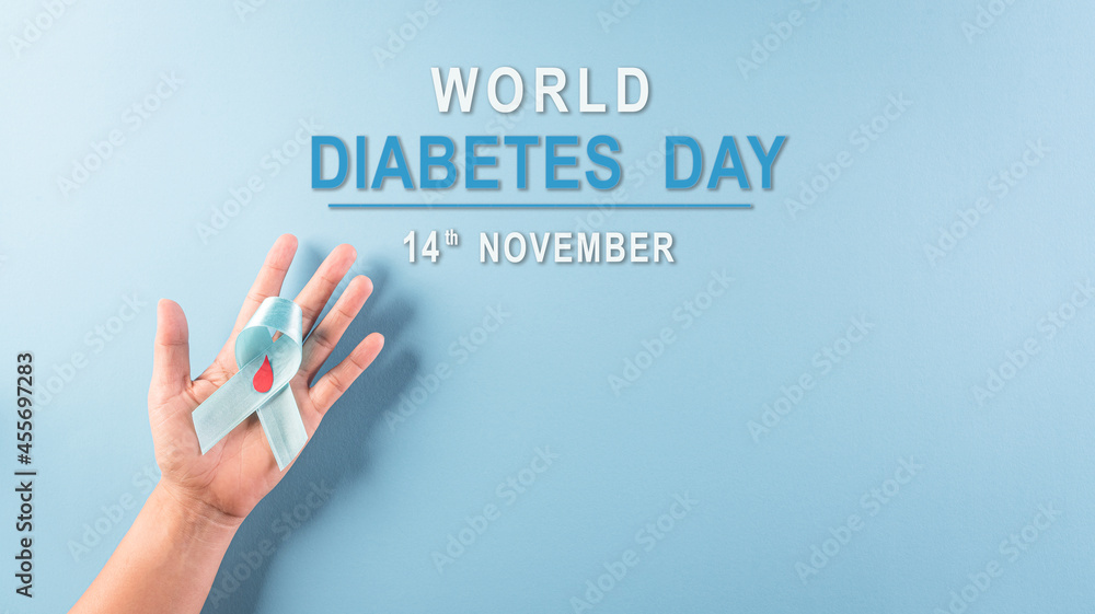 World diabetes day awareness concept. Hand holding blue ribbon, symbolic bow color raising awareness in diabetes day on pastel background, 14 November.