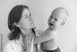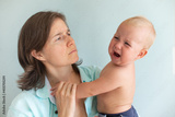 Tired mom trying to calm her crying infant baby on hands. Newborn tantrum. Motherhood concept. Depressed woman with child at home