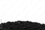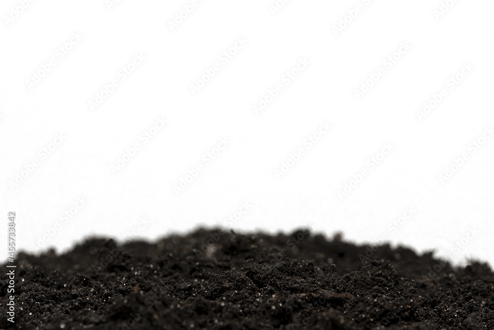 A pile of black earth close-up on a white background, isolate. Earthen soil for seedlings of plants.
