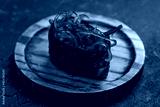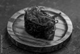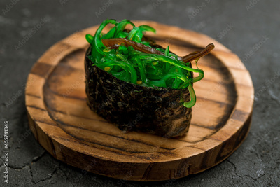 gunkan with chuka seaweed on a little circle board close up macro on black stone table