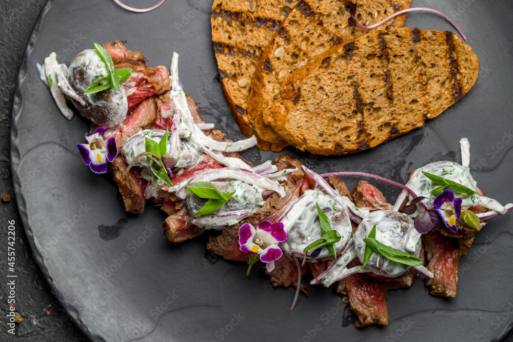 Sliced roast beef with mushrooms and onion on sour cream on black plate