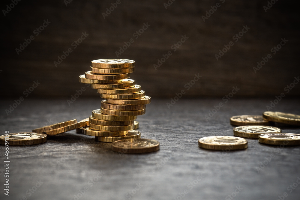 tower of coins, metal money stacked on the table on a dark background, financial and banking concept, savings, deposit insurance, stock exchange, taxes, wealth
