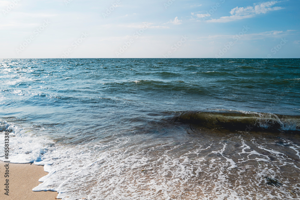 Seascape with undercurrent waves rolling in over the tropical beach at dawn