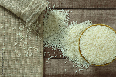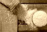 Uncooked dry Thai jasmine rice are overflow from bowl and burlap bag beside put on wood floor, angle of view flat lay and top down horizontal view.