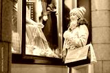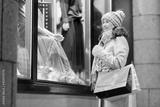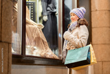 holidays and people concept - happy woman with shopping bags looking at shop window in winter city
