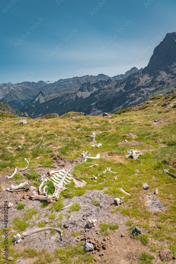 Dead animal bones on top of a mountain with green grass. Wild nature. Life and death concept.
