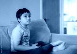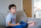 Young boy playing video games online, Candid shot Happy mixed race child sitting on sofa holding game console. Portrait kid face looking up while relaxing at home on weekend