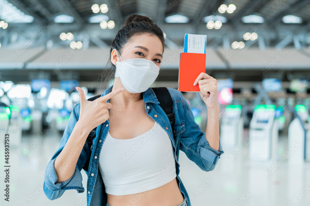 happiness smiling asian adult female wear face mask hand gesture showing passport and blank screen smartphone at aitport terminal,asian female ready to travel after lockdown ia over at airport