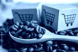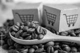 Box with shopping cart logo symbol on coffee beans, Import Export Shopping online or eCommerce delivery service store product shipping, trade, supplier concept.